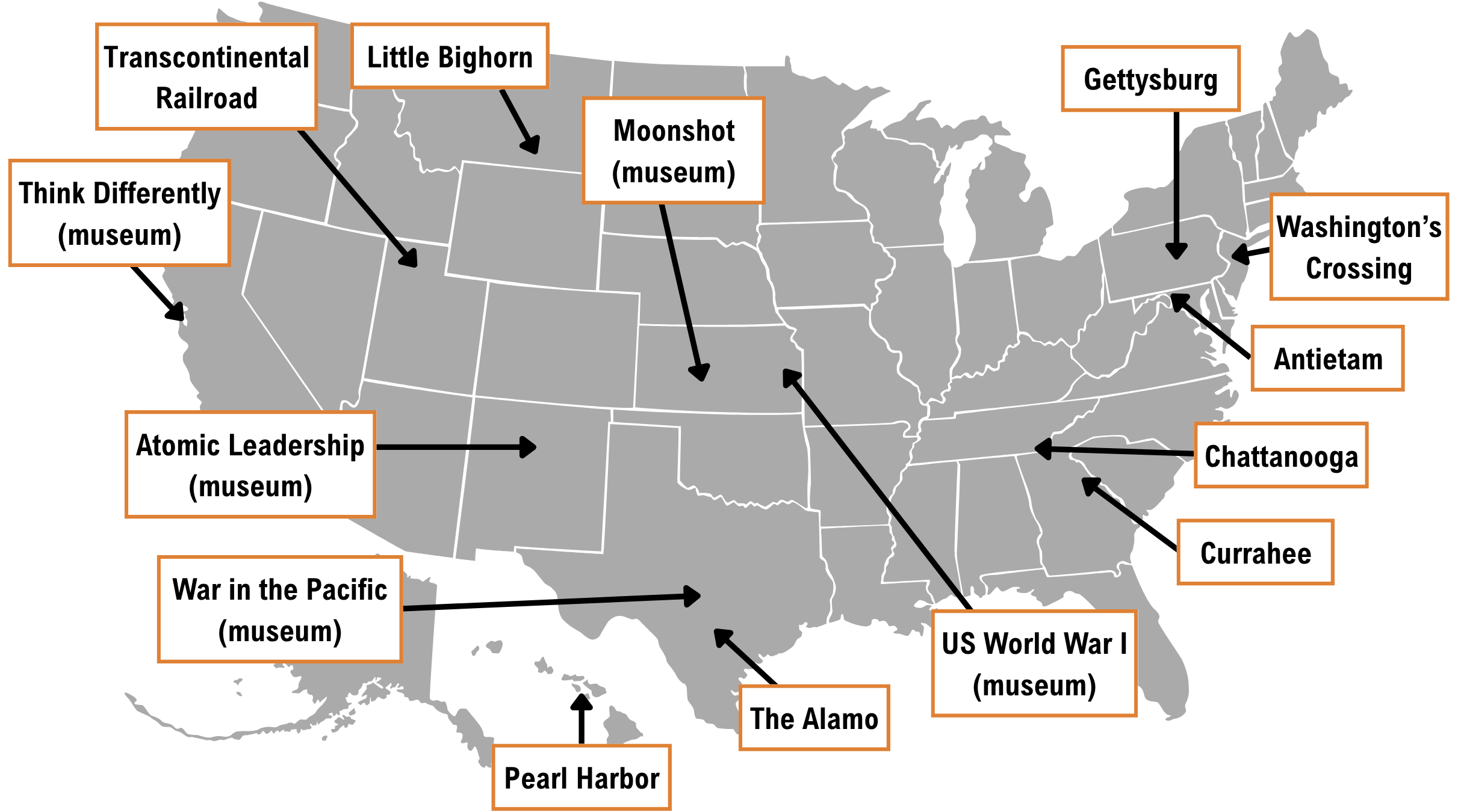 THINK DIFFERENTLY (museum) | TRANSCONTINENTAL RAILROAD | LITTLE BIGHORN | MOONSHOT (museum) | GETTYSBURG | ANTIETAM | WASHINGTON’S CROSSING | CHURCHILL | MARKET-GARDEN | WATERLOO | ATOMIC LEADERSHIP (museum) | WAR IN THE PACIFIC (museum) | PEARL HARBOR | THE ALAMO | US WORLD WAR I (museum) | CURRAHEE | CHATTANOOGA | NORMANDY | BASTOGNE | US IN WORLD WAR I (Europe)